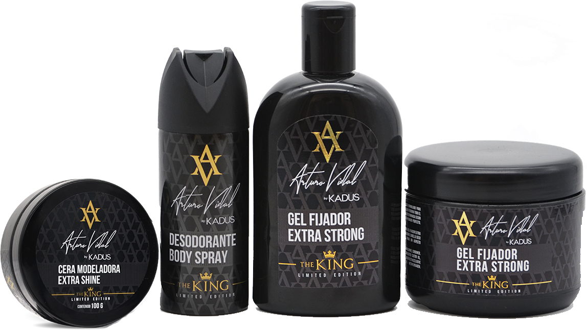 Arturo Vidal By KADUS, es una Línea Masculina de Edición Limitada, especialmente formulada con materias primas de alta calidad y una exclusiva fragancia inspirada en “The King”. #ParaOlerComoRey Cera Extra Shine Kadus AV Pote 100 Gr Desodorante Kadus AV Spray 150 ML Gel Extra Strong Kadus AV Fco 500 Gr Gel Extra Strong Kadus AV Pote 500 Gr